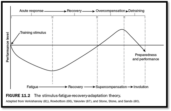 - Recovery: When demonstrating the importance of recovery I like to refer to the below figure visually representing the “stimulus- fatigue-recovery-adaptation theory.” If as strength and conditioning coaches all we focus on is providing an optimal training stimulus we are only accounting for half of the equation that equals an improvement in performance. As research in the area of recovery is a hot topic in the industry, it is important that coaches read recent literature and listen to the experts in this area to ensure their recovery programs currently align with best practice guidelines.