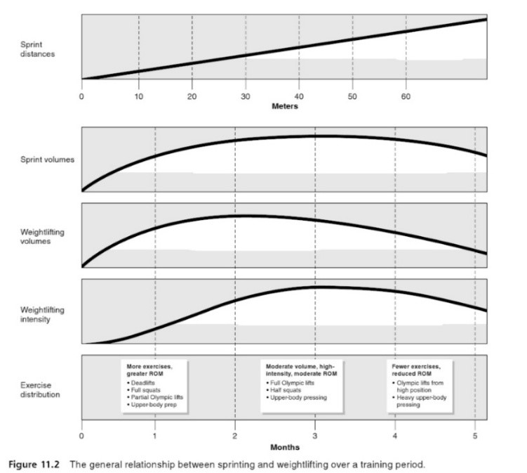 One of the main points to take away from this article is that acceleration and max velocity are separate qualities requiring different training focuses. When planning a program it is important to implement loading and progression strategies that allow the athlete to develop whilst reducing risk of injury. The short-to-long approach is one method of speed development which compliments traditional weightlifting progressions. In this approach athletes begin with shorter distances with an emphasis on acceleration ability before gradually increasing distances and incorporating maximal velocity work. The figure below from Dan Lewindon and David Joyce’s High performance training for sport (chapter 10 from Derek Hansen) explains the interplay of weightlifting and sprinting throughout a periodised training plan (8).
